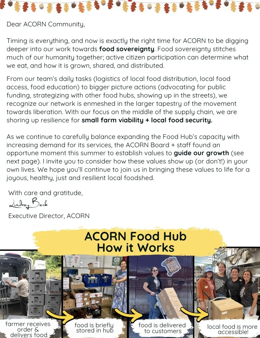 Since our founding in 2005, ACORN has been weaving a more resilient, localized food system in Vermont’s Champlain Valley by providing support to farmers and food producers, deepening agricultural engagement in our community and ensuring access to local healthy food for all.